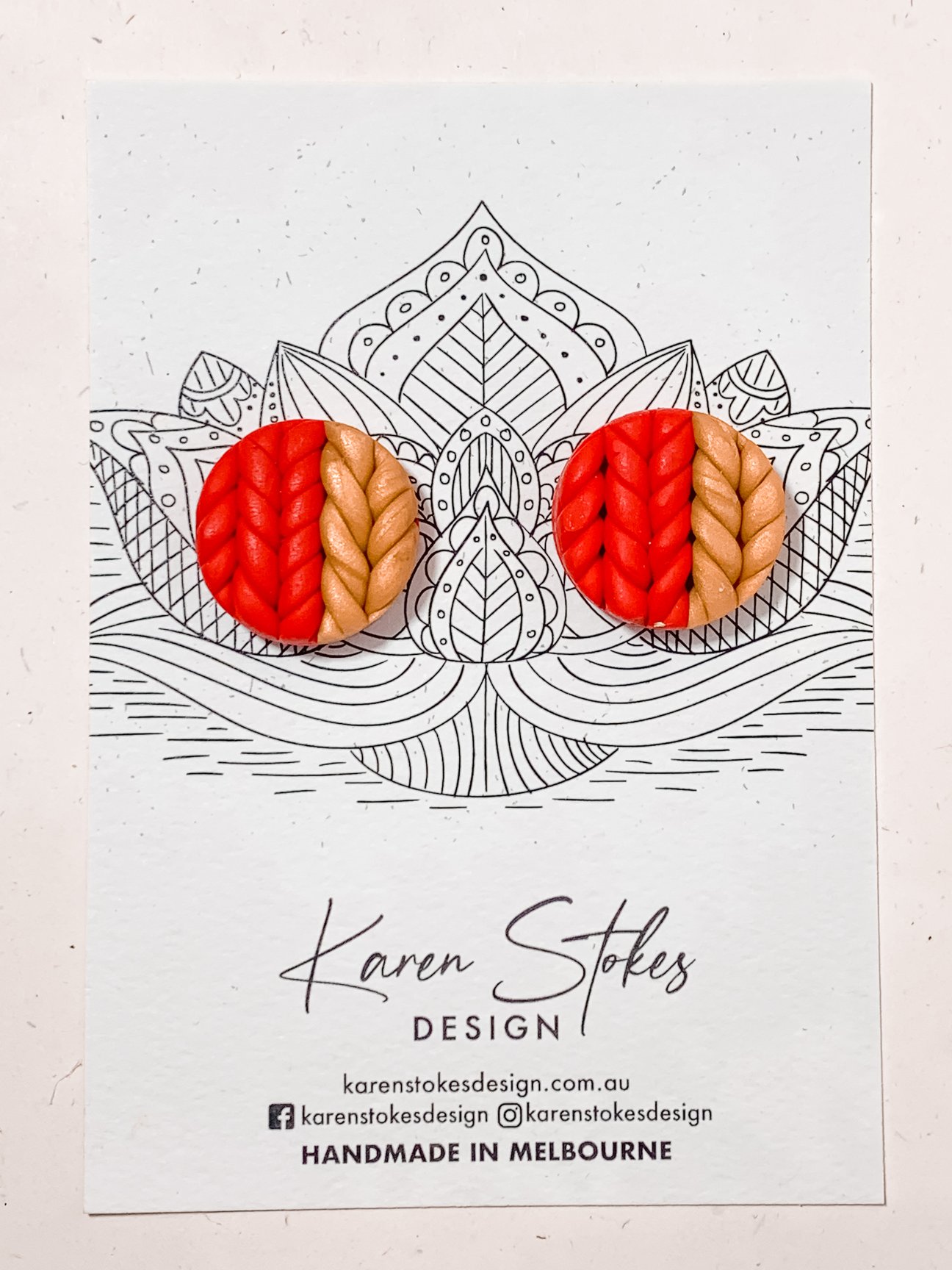 Polymer clay Surgical steel nickel free posts 10mm gold jump rings Comfort stoppers (earring backs) Width: 25mm Length: 37mm Our creations: Polymer clay is a wonderful, easy to wear, lightweight option. Many of you have ear sensitivity, so that is why I always use surgical steel ear-posts when I handcrafting your new jewellery.